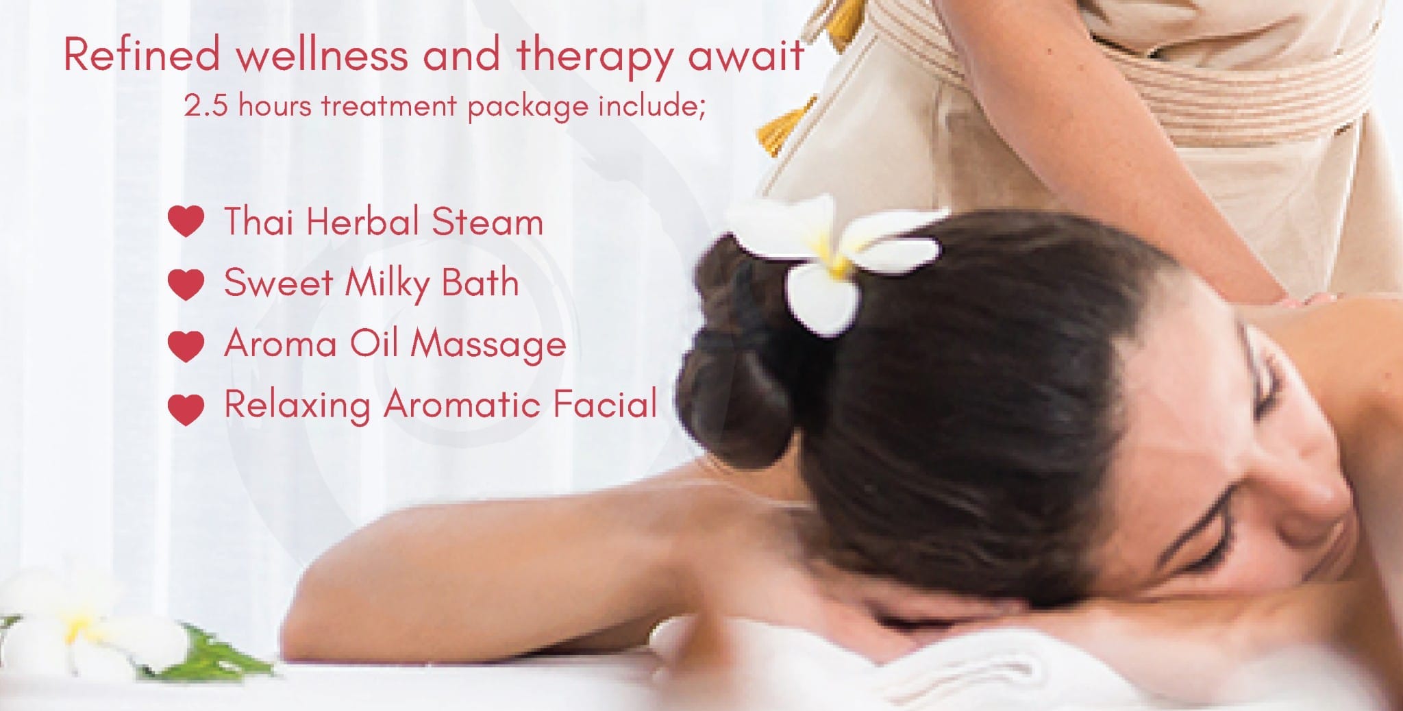 Unwind and pamper yourself with the one you love on this special seasons with our refined wellness of 2.5-hour romantic treatment package that will alleviate your tiresome and loosen muscle intensity.